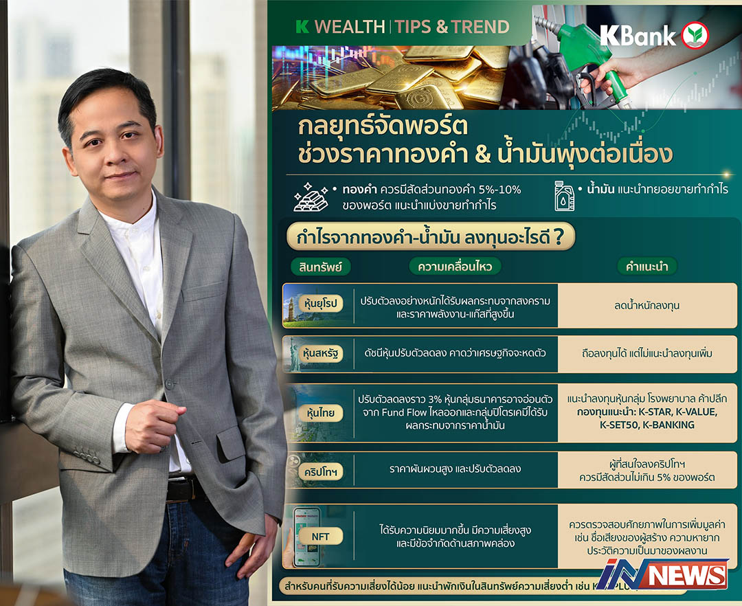 กรุงเทพฯ-K WEALTH โดยธนาคารกสิกรไทย แนะนำกลยุทธ์ปรับพอร์ตช่วงราคาทองคำและน้ำมันขึ้นสูงเป็นประวัติการณ์ ให้ทยอยขายบา...