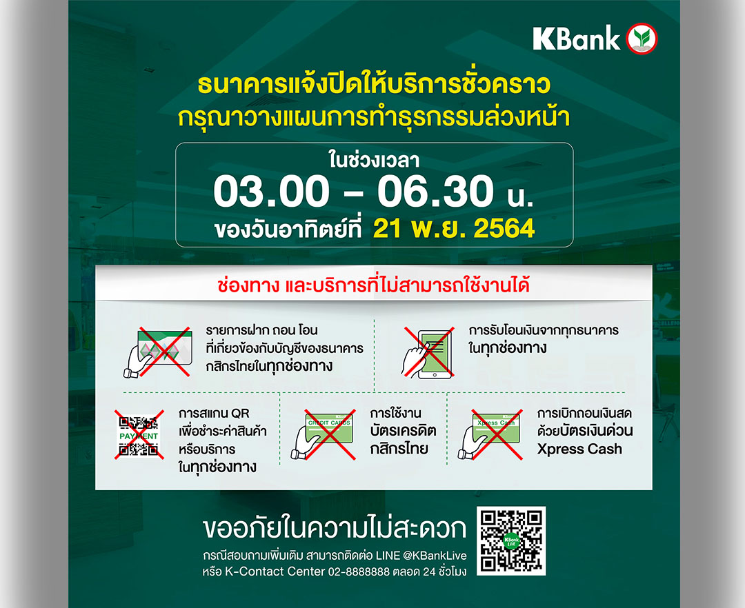 กสิกรไทยแจ้งปิดบริการชั่วคราว21พ.ย.นี้ งดให้บริการฝาก-ถอน-โอนเงิน
