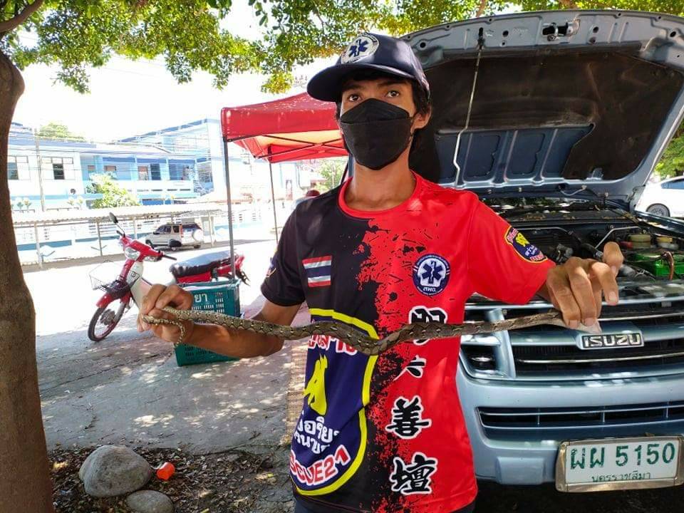 นครนายก-ลูกงูเหลือมเลื้อยมาเข้าห้องเครื่องรถยนต์ที่แม่ค้าจอดขายผลไม้อยู่ข้างทาง แม่ค้าเห็นงูเลื้อยเข้ารถรีบหนีกระเจิง
