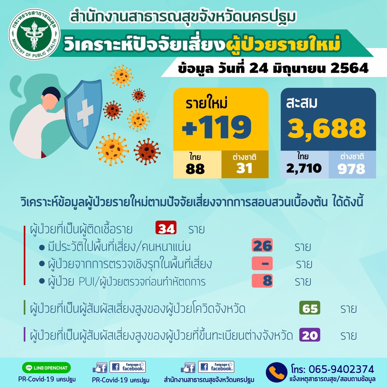 นครปฐม-ผู้ป่วยโควิด-19 พุ่งไม่หยุดตรวจพบอีก 119 รายรวมผู้ป่วยสะสม 3,688 ราย