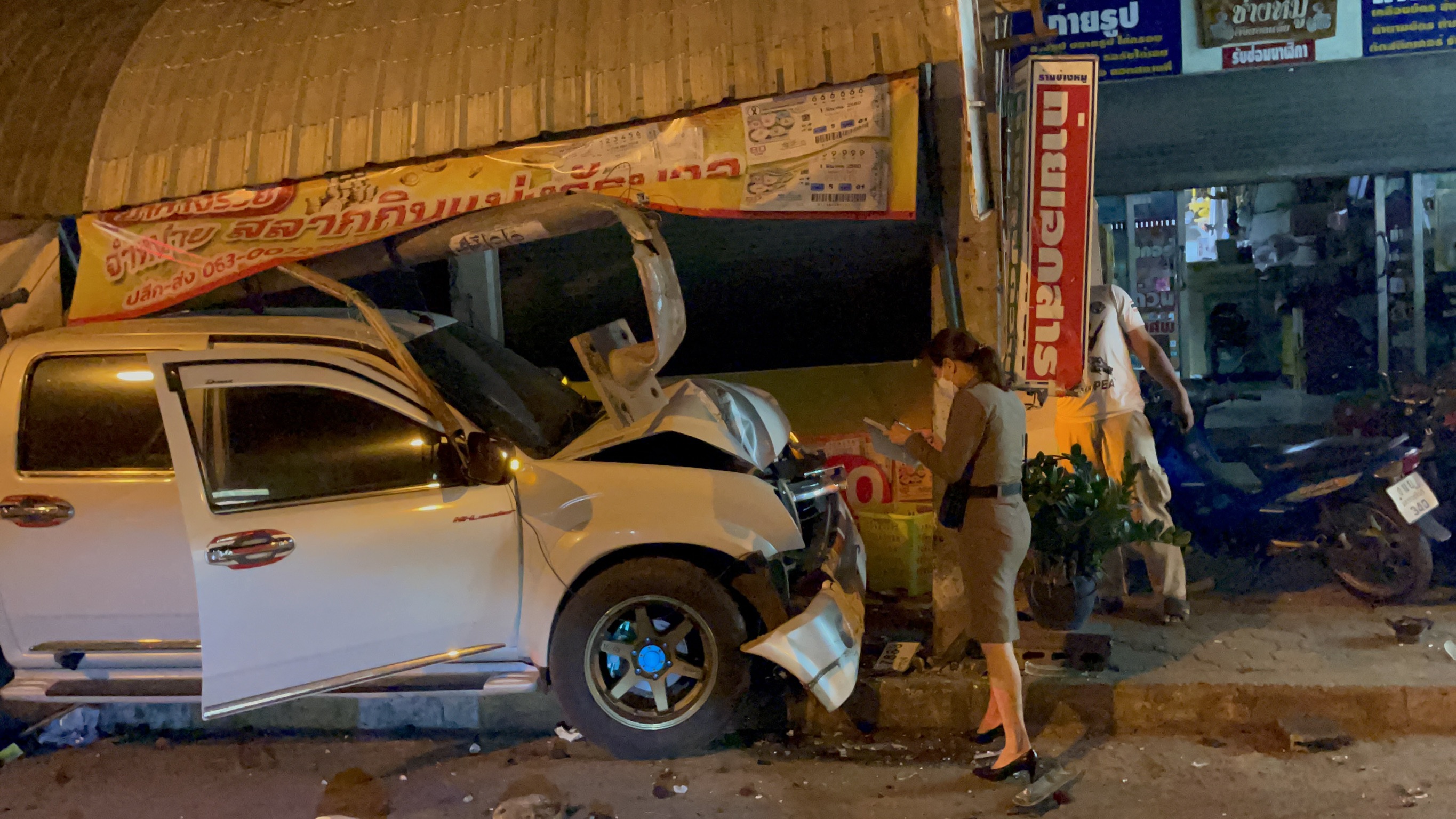 นครราชสีมา-หนุ่มเมาหนักควบกระบะพุ่งชนแผงขายผลไม้และเสาไฟส่องสว่างพังยับเจ้าของแผงโอดเพิ่งทำร้านใหม่เสียหายนับแสนบาท