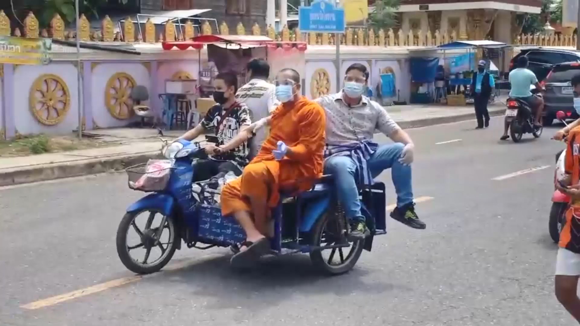สงขลา-สีสัน..เจ้าอาวาสวัดไทรงาม สงขลาและสรรเพชญ บุญญามณี นั่งรถจักรยานยนต์พ่วงข้างนำฟักทอง ฟักเขียว และแตงโมไปแจกชาวบ้าน...