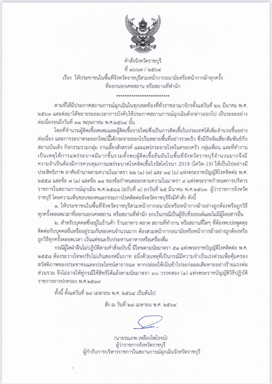 จ.ราชบุรีออกคำสั่งใช้ยาแรง ไม่สวมหน้ากากอนามัยอย่างถูกวิธีเมื่ออยู่นอกเคหสถาน จับปรับ 2 หมื่นบาท เริ่ม 29 เม.ย.นี้