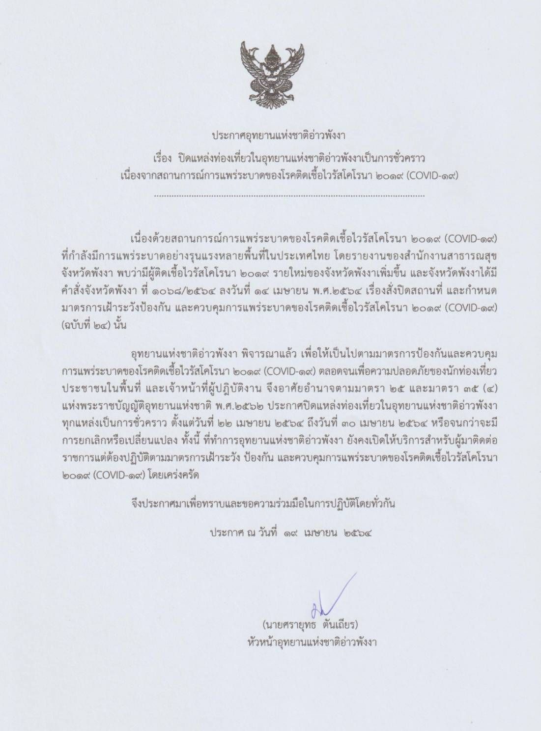 พังงา-อุทยานแห่งชาติอ่าวพังงา ปิดอ่าวพังงาเป็นการชั่วคราว 22 - 30 เมษายน 2564 หรือจนกว่าจะมีการเปลี่ยนแปลง เพื่อป...
