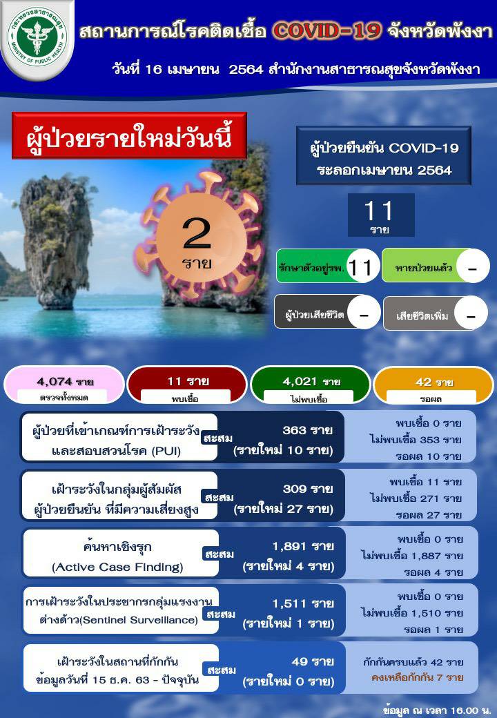 พังงา-พบผู้ป่วยเพิ่มอีก 2 ราย สัมผัสกลุ่มติดเชื้อจากทหารเรือภูเก็ต 1 ราย ติดจากนักท่องเที่ยวจากสมุทรปราการ 1 ราย ภาคเอกช...