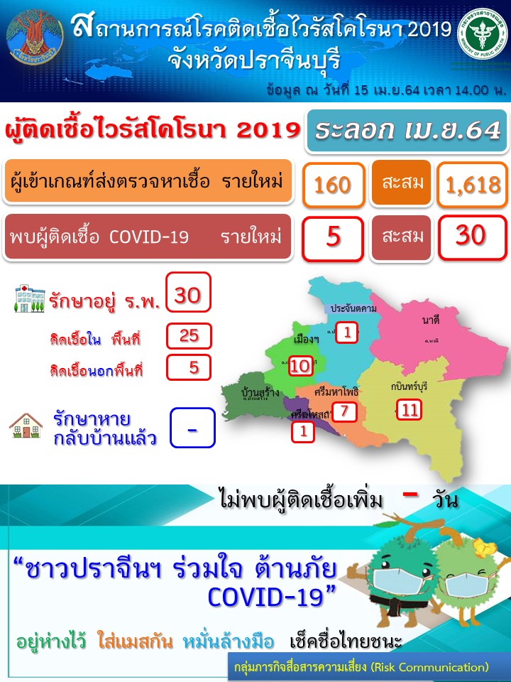 ปราจีนบุรี-สสจ.ปราจีนบุรียืนยันวันนี้พบผู้ป่วยโควิด-19 เพิ่มต่ออีก 5 ราย รวมทั้งหมด 30 ราย