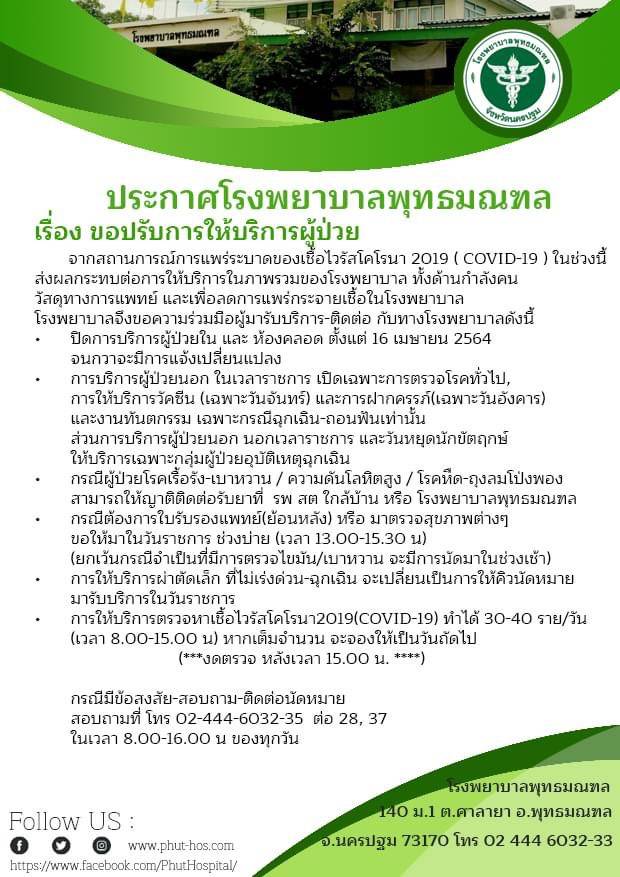 นครปฐม-โรงพยาบาลพุทธมณฑล ได้ประกาศขอปรับการใช้บริการผู้ป่วยในช่วงวิกฤตโควิด-19