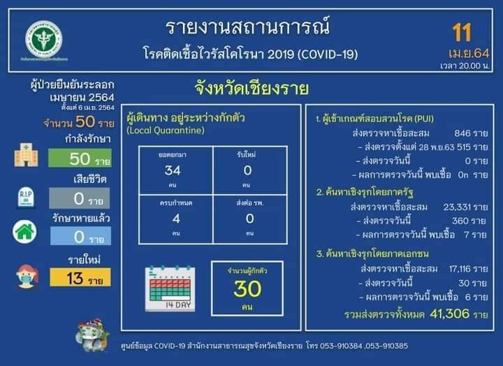 เชียงราย-สสจ.เชียงราย เผย ยอดผู้ป่วยไวรัสโควิด-19 สะสม ทะลุ 50 รายแล้ว โดยเป็นรายใหม่ 13 ราย ส่วนมากติดจากกลุ่มคลั...