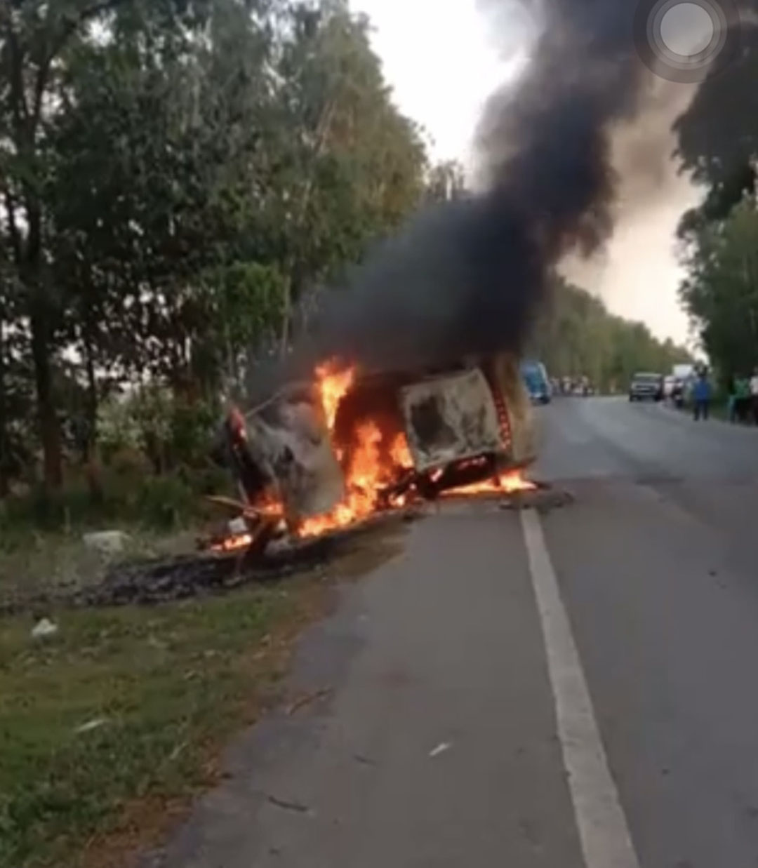 มหาสารคาม-ย่างสด! รถยนต์ขับด้วยความเร็วหลุดโค้งชนหลักกม.ไฟลุกท่วม ส่งผลให้คนขับถูกไฟครอบดับคาที่