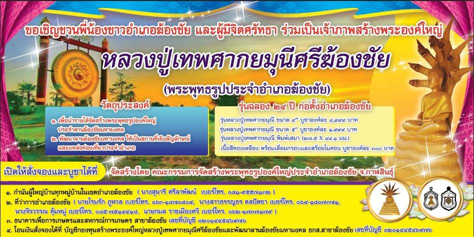 กาฬสินธุ์-คณะกรรมการจัดสร้างพระพุทธรูปองค์ใหญ่ ประจำอำเภอฆ้องชัย จังหวัดกาฬสินธุ์ เชิญชวนพุทธศาสนิกชน ผู้มีจิตศรัทธา สั่...