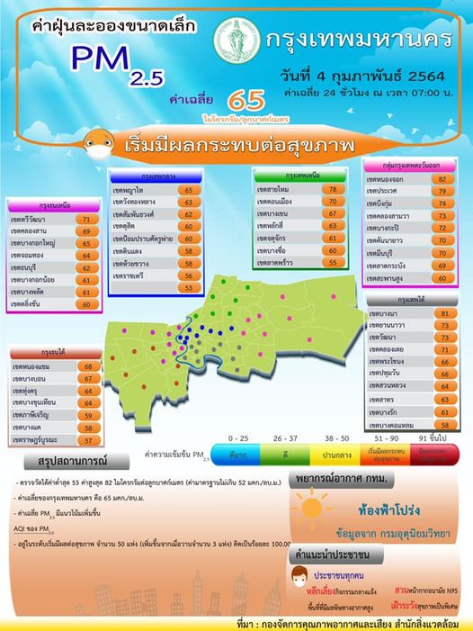 กรุงเทพฯ-ผลการตรวจวัดฝุ่นละอองขนาดไม่เกิน 2.5 ไมครอน (PM2.5) วันที่ 4 กุมภาพันธ์ พ.ศ. 2564 เวลา 07.00 น. ค่าเฉลี่ย 24 ช...