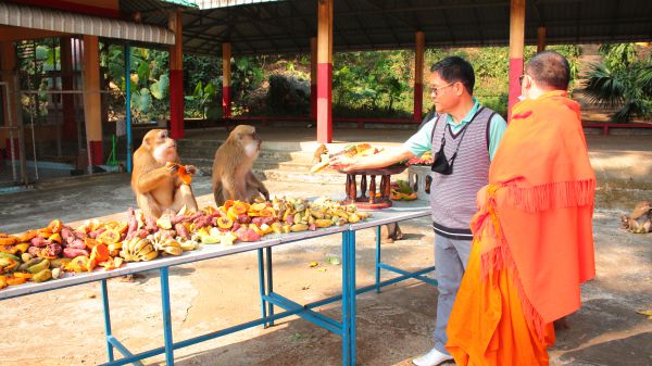 เยียวยาลิง!อบต.โป่งงาม-พระ-ชาวบ้าน จัดขันโตกให้ลิง800ตัวอดอยากจากโควิด