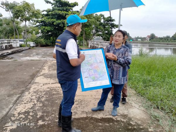 สส.จอมขวัญ-ผอ.ชลประทานดูแก้มลิงเตรียมพร่องน้ำรับมือมวลน้ำ-น้ำท่วม