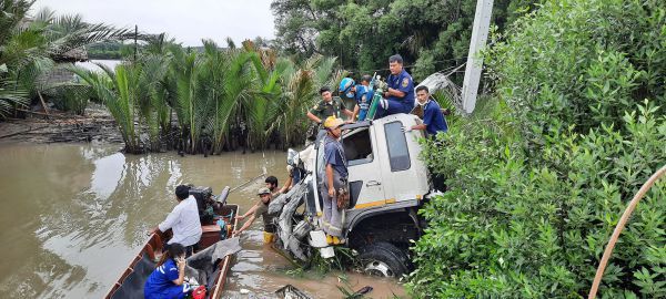 สมุทรปราการ--18 ล้อพ่วงมาลัยหลุดเหินสะพานชนเสาไฟฟ้าในคลองภรรยานั่งข้างกระเด็นอัดตัดเสาไฟบาดเจ็บ