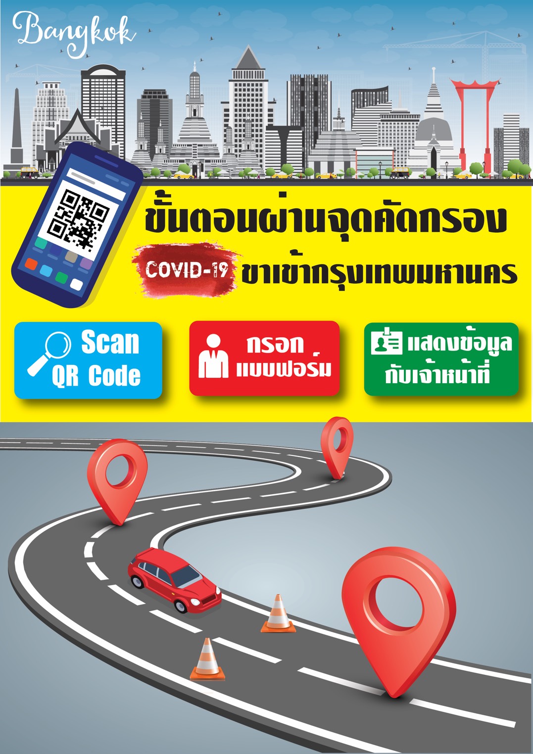 กรุงเทพฯ- BKK COVID-19 สำหรับด่านคัดกรองรูปแบบใหม่ เพียง 2 ขั้นตอน ลดเวลาการผ่านด่าน คือการสแกน QR CODE จากนั้นกรอกแบบฟอ...
