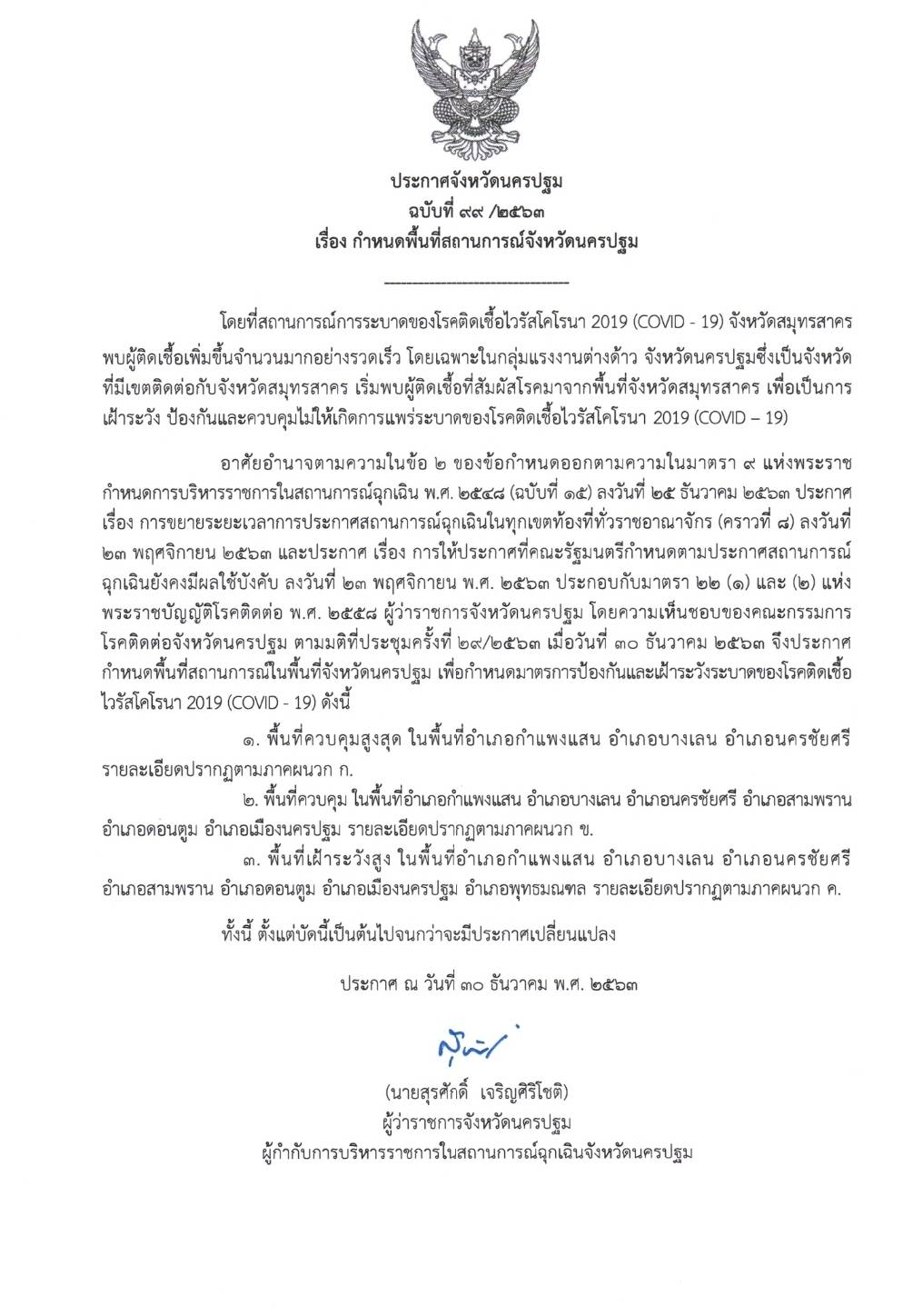 นครปฐม- ผู้ว่าฯนครปฐมประกาศจังหวัดนครปฐม ฉบับที่ 99/2563 เรื่อง กำหนดพื้นที่สถานการณ์ในจังหวัดนครปฐม เพื่อกำหนดมาตรการป้...