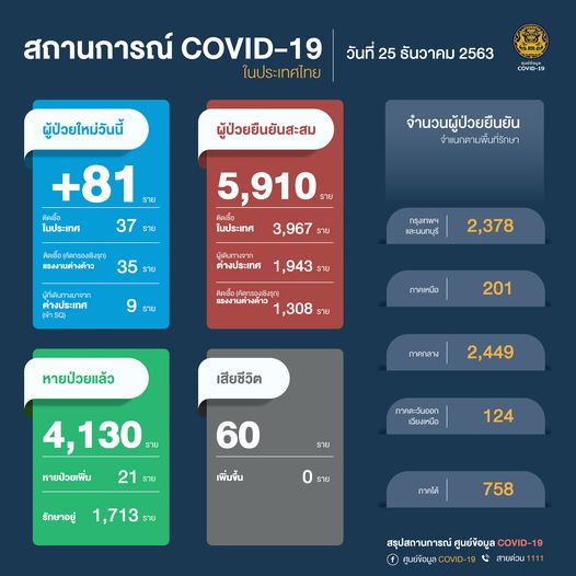 กรุงเทพฯ-ศูนย์บริหารสถานการณ์โควิด-19 ประจำวันศุกร์วันศุกร์ที่ 25 ธันวาคม 2563 เวลา 11.00 น.สถานการณ์การติดเชื้อ COVID-1...