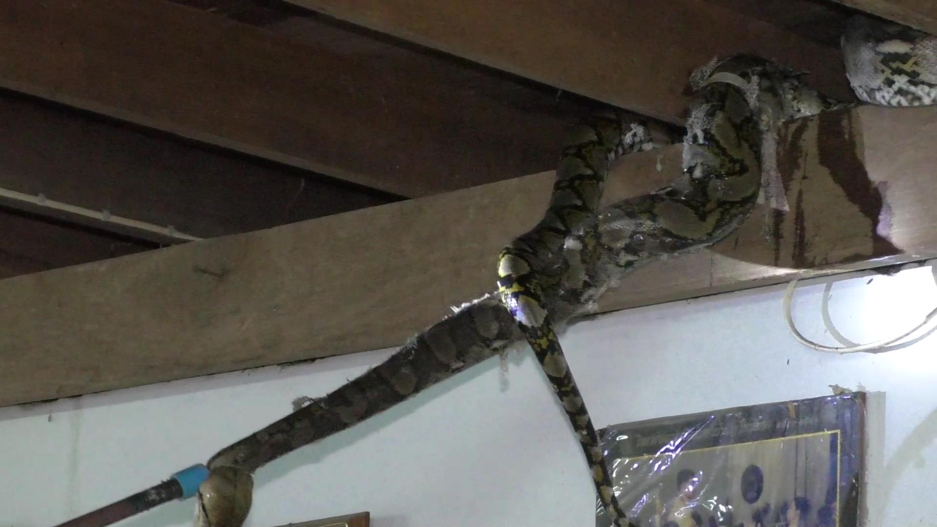 ฮือ!พญางูเหลือมเลี้อยพำนักบนขื่อบ้าน คอหวยวังโป่งส่องเบอร์บ้านหาเลขเด็ด