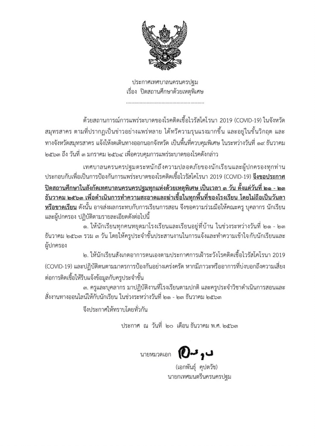 นายกฯทน.นครปฐมสั่งปิดโรงเรียน3วัน หลังพบผู้ป่วย2คนสั่งเช็คไทม์ไลน์-ล้างรร.