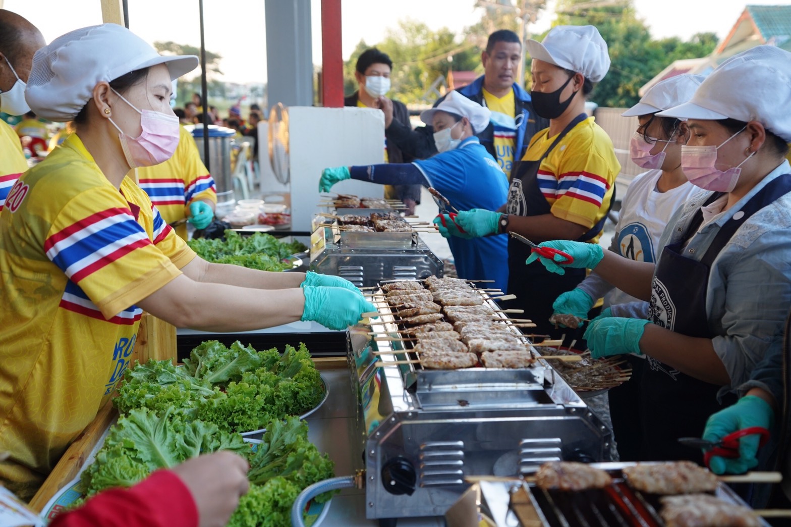 นครปฐม-เสี่ยเจ้าของบริษัทเทพประทานอิมปอร์ต เอ็กซ์ปอร์ต จำกัด ผู้ผลิตเนื้อหมู ไก่ แปรรูปขนทีมงานตั้งโต๊ะแจกหมูปิ้ง 2 พันไ...