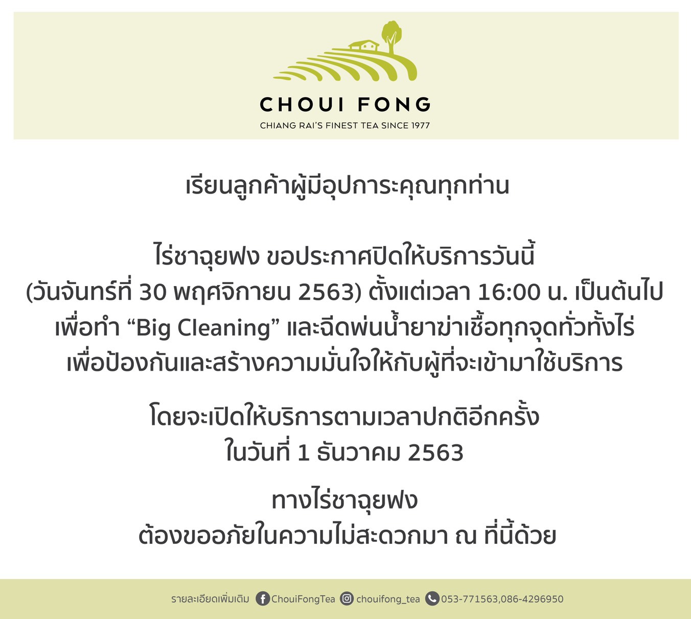 เชียงราย- ไร่ชาชื่อดัง “ฉุยฟง” อ.แม่จัน จ.เชียงราย ปิดบริการ 1 วัน ทำ "Big Cleaning" และฉีดพ่นน้ำย...