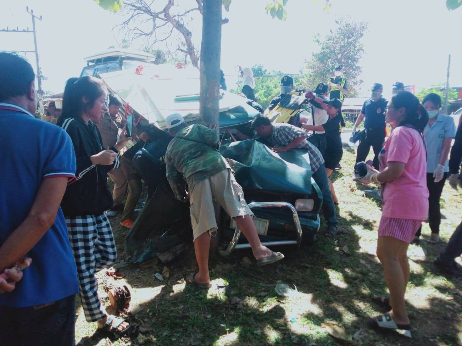 ชัยภูมิ กระบะหลับในพุ่งชนต้นไม้ข้างทางรถกระบะช่างรับเหมาตกแต่งภายในหลับในเสียหลักลงข้างทางชนต้นไม้เจ็บ 3 สาหัส 1