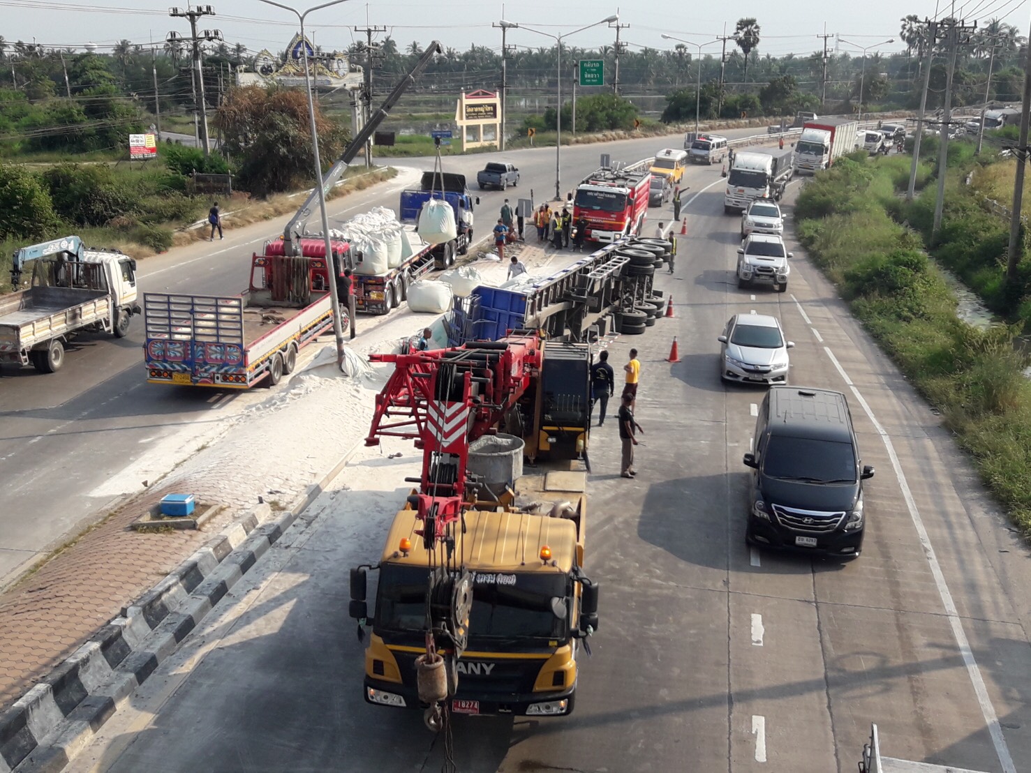 นครปฐม-รถบรรทุกแก๊สพยายามแซงรถบรรทุกพ่วงขนแป้งมันมา 30 ตันเกิดเสียหลัก ช่วงเข้าโค้งคนขับรถแป้งเบรกไม่อยู่หักหลบผลรถพลิกค...