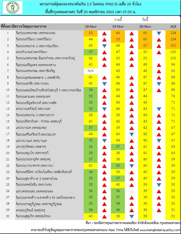 กรุงเทพฯ-ศูนย์ประสานงานและแก้ไขปัญหามลพิษทางอากาศในกรุงเทพมหานครรายงานสถานการณ์ฝุ่นละอองขนาดไม่เกิน 2.5 ไมครอน (PM 2.5) ...
