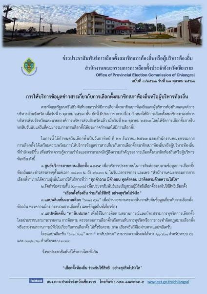 กกต.เชียงรายเคาะแล้ววันรับสมัครท้องถิ่น ดีเดย์2-6พ.ย.นี้รับส.อบจ.-นายกฯอบจ.