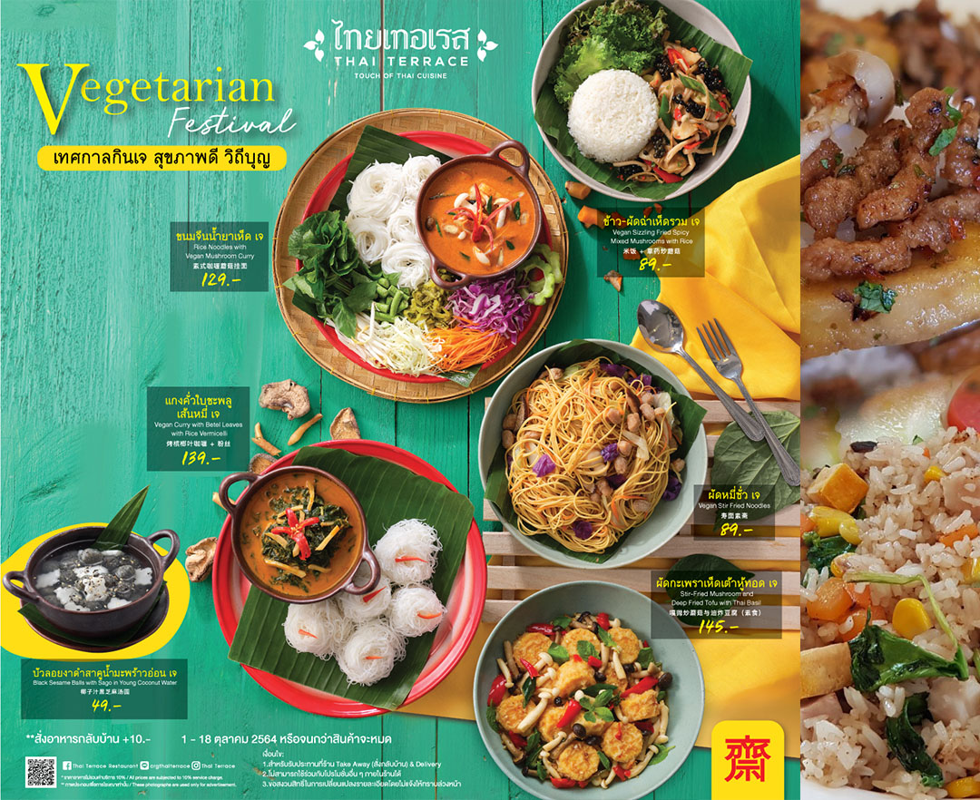 2. “ไทยเทอเรส” ขอต้อนรับ VEGETARIAN FESTIVAL เทศกาลกินเจ สุขภาพดีวิถีบุญ ด้วยเมนูเจแสนอร่อย จัดสำรับให้ทั้งอาหารคาว-หวาน รายการอาหาร ดังนี้ 1. ข้าวผัดฉ่าเห็ดรวม เจ ราคา 89 บาท 2. ผัดหมี่ซั่วเจ ราคา 89 บาท 3. ขนมจีนน้ำยาเห็ดเจ ราคา 129 บาท 4. แกงคั่วใบชะพลู- เส้นหมี่ เจ ราคา 139 บาท 5. ผัดกะเพราเห็ดเต้าหู้ทอด เจ ราคา 145 บาท 6. บัวลอยงาดำสาคูมะพร้าวอ่อน เจ ราคา 49 บาท