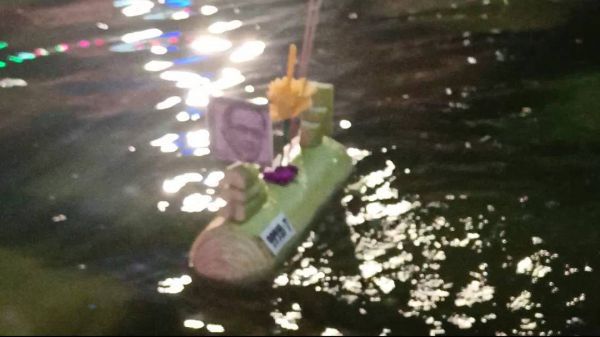 สีสันวันลอยกระทงชาวปราจีนบุรีล้อแรง ลอยกระทงเรือดำน้ำพร้อมรูปลุงตู่