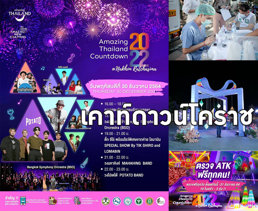 การท่องเที่ยวแห่งประเทศไทย (ททท.) และจังหวัดนครราชสีมา ขอเชิญร่วมเฉลิมฉลองเทศกาลปีใหม่อย่างปลอดภัยกับงานเทศกาลส่งท้ายปีเก่าต้อนรับปีใหม่ Amazing Thailand Countdown 2022-Amazing New Chapters @ Nakhon Ratchasima ตั้งแต่วันนี้ – 31 ธันวาคมนี้ ณ บริเวณศาลากลางจังหวัดนครราชสีมา ซึ่งจัดขึ้นภายใต้มาตรการป้องกันการแพร่ระบาดของโรคติดเชื้อไวรัสโคโรนา 2019 หรือ Covid Free Setting โดย ททท. ขอมอบของขวัญปีใหม่ ด้วยการเปิดโอกาสให้ทุกคนสามารถร่วมงานได้ง่ายขึ้น ผู้ร่วมงานทุกคนสามารถตรวจ ATK ฟรี!!! พร้อมรับใบรับรองจากสาธารณสุขได้ที่จุดตรวจ ATK ณ บริเวณด้านหลังอนุสาวรีย์ ร.5 หน้าศาลากลางจังหวัดฯ จากเดิมราคา 90 บาท/คน รวมทั้งขยายเวลาเปิดให้บริการตั้งแต่เวลา 10.00-21.00 น.ตั้งแต่ วันนี้ - 31 ธ.ค. 64 พร้อมแสดง บัตรประชาชน, หลักฐานการฉีดวัคซีนครบ 2 เข็ม ณ จุดคัดกรองก่อนเข้างาน