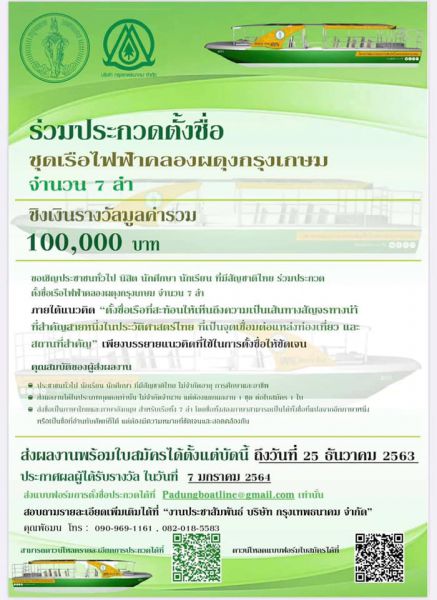 นายประพาส เหลืองศิรินภา รองผู้อำนวยการสำนักการจราจรและขนส่ง กทม. รักษาราชการแทนผู้อำนวยการสำนักการจราจรและขนส่ง เปิดเผยว่า กรุงเทพมหานคร โดย สำนักการจราจรและขนส่ง และบริษัท กรุงเทพธนาคม จำกัด ขอเชิญชวนประชานทั่วไป ร่วมประกวดตั้งชื่อ “เรือไฟฟ้าคลองผดุงกรุงเกษม” จำนวน 7 ลำ ชิงเงินรางวัลมูลค่ารวม 100,000 บาท ภายใต้แนวคิด "ตั้งชื่อเรือที่สะท้อนให้เห็นถึงความเป็นเส้นทางสัญจรทางน้ำที่สำคัญสายหนึ่งในประวัติศาสตร์ไทย ที่เป็นจุดเชื่อมต่อแหล่งท่องเที่ยว และสถานที่สำคัญ" เพียงบรรยายแนวคิดที่ใช้ในการตั้งชื่อให้ขัดเจน โดยสามารถส่งผลงานพร้อมใบสมัครได้ตั้งแต่บัดนี้ ถึงวันที่ 25 ธันวาคม 2563 ประกาศผลผู้ได้รับรางวัล ในวันที่ 7 มกราคม 2564 ผู้สนใจสามารถส่งแบบฟอร์มการตั้งชื่อประกวดได้ที่ Padungboatline@gmail.com เท่านั้น โดยสามารถดาวน์โหลดรายละเอียดการประกวดและแบบฟอร์มใบสมัครได้ตาม QR CODE ที่กำหนด สอบถามรายละเอียดเพิ่มเติมได้ที่ "งานประชาสัมพันธ์ บริษัท กรุงเทพธนาคม จำกัด" โทร : 090-969-1161 , 082-018-5583
