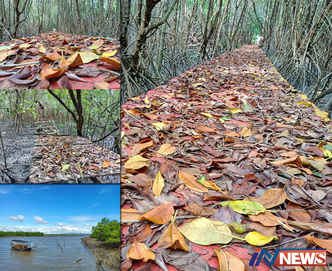 ที่ปูวางเรียงกับพื้นโรยทอดยาวไปบนแนวสะพานของเส้นทางเดินศึกษาธรรมชาติ ทำให้มองดูคล้ายดังกับว่า มีใครนำผืนพรมที่ถักทอสานต่อกันด้วยใบไม้มาวางเรียงรายไว้ให้ผู้คนที่เพิ่งได้เข้ามาสัมผัส ได้เดินทอดน่องไปตามเส้นทางบนสะพานที่ยังหลงเหลืออยู่ สลับกับสีของพื้นสะพานที่เคยมีคนมาบรรจงทาวาดลวดลายสลับแถบเหลืองแดง และมีภาพของโลมาสัตว์น้ำประจำถิ่นติดเอาไว้ที่พื้นเป็นสัญลักษณ์