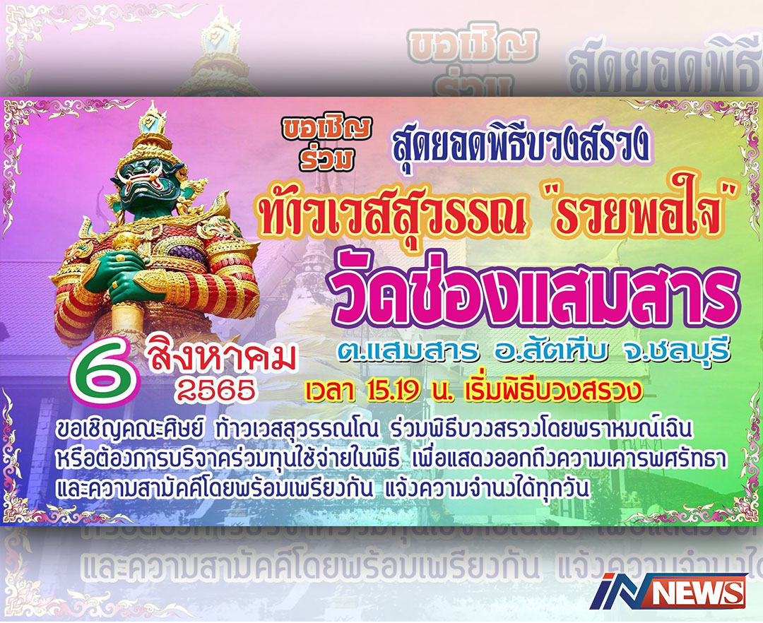 ในวันเสาร์ที่ 6 ส.ค.65 เวลา 15.19 น. พระครูวิสารทสุตากร เจ้าคณะตำบลพลูตาหลวง/เจ้าอาวาสวัดช่องแสมสาร ต.แสมสาร อ.สัตหีบ จ.ชลบุรี จะจัดพิธีบวงสรวงท้าวเวสสุวรรณ ณ บริเวณวิหารหลวงพ่อดำ เขาเจดีย์ ซึ่งทางวัดจัดพิธีบวงสรวงและเบิกเนตรเพื่อให้ถูกต้องตามพิธีกรรม ศิษยานุศิษย์และผู้ที่มีความศรัทธาขอเชิญร่วมพิธีได้ตามวันและเวลาดังกล่าว รับท้าวเวสสุวรรณ 1 องค์หลังเสร็จพิธี