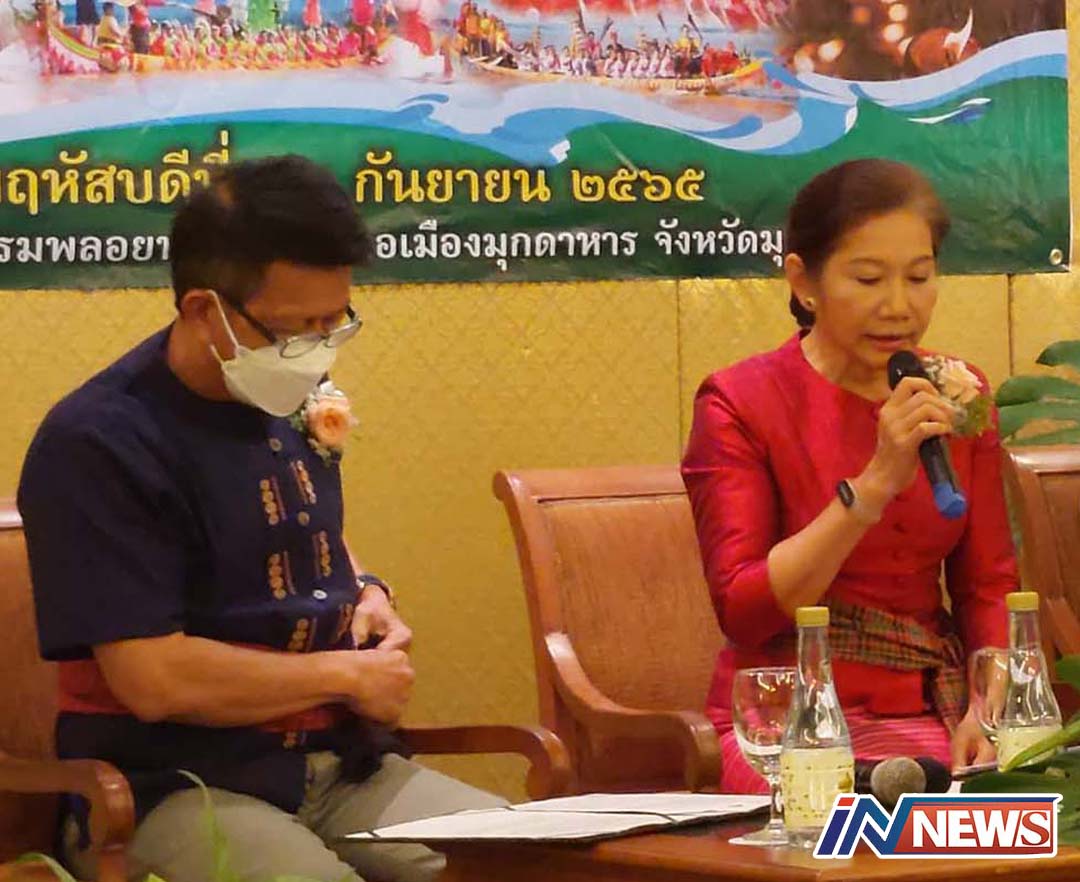 วันนี้ ( 16 ก.ย.65 ) ที่ห้องไพลิน โรงแรมพลอยพาเลช จังหวัดมุกดาหาร นางสุวรรณี ตั้งปณิธานนท์ นายกเทศมนตรีเมืองมุกดาหาร พร้อมด้วย นายไชยา อุ่นอารีย์กุล รองนายกองค์การบริหารส่วนจังหวัดมุกดาหาร นางวรรณา บุดดีสิงห์ ท่องเที่ยวและกีฬาจังหวัดมุกดาหาร ร่วมกันแถลงข่าว จัดงานประเพณีแข่งเรือออกพรรษา ภายใต้ชื่องาน แข่งเรือยาวออกพรรษา ตีช้างน้ำนอง แข่งเรือยาวโบราณ สานประเพณีสองฝั่งโขง เชื่อมโยงไหลกะจู้ ปี 2565
