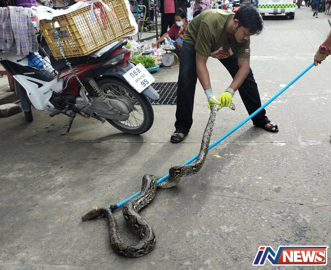 ชาวบ้านจ่ายตลาดพบงูเหลียมโผล่หัวในรางเหล็กท่อระบายน้ำตกใจเข็นรถหนี