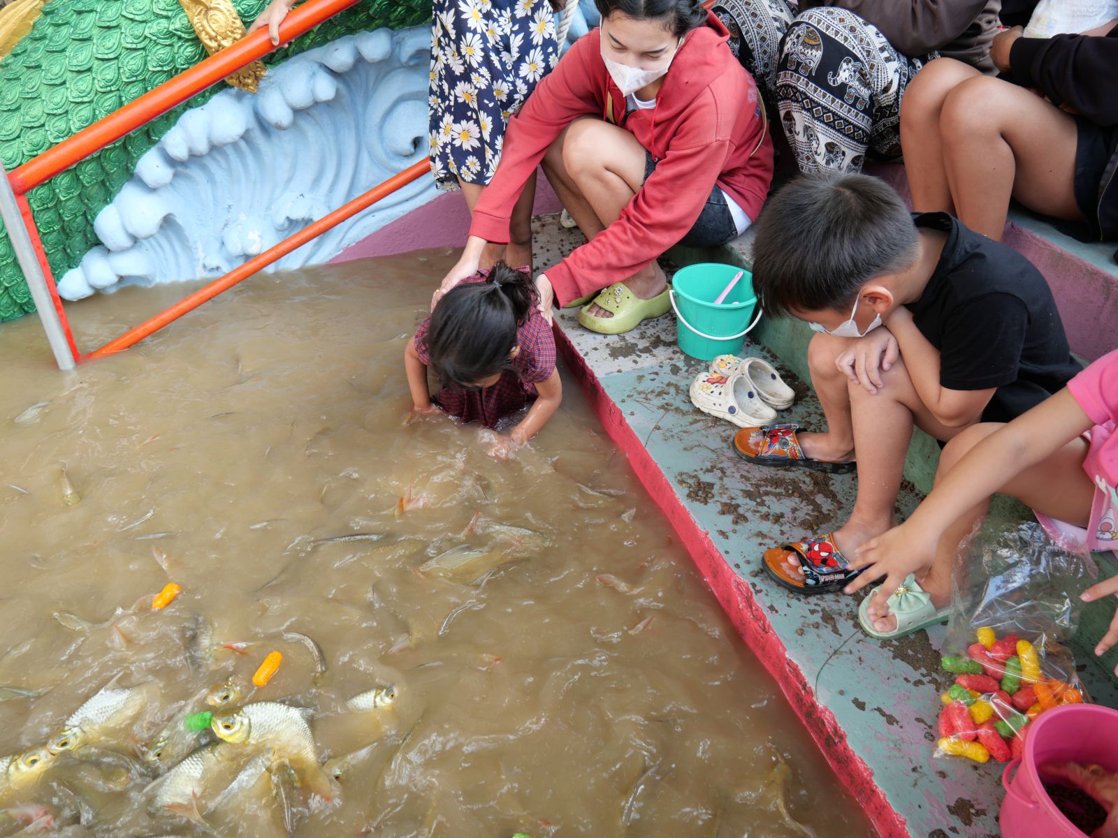 กาญจนบุรี-วัดหวายเหนียว กาญจน์ พลิกวิกฤตน้ำท่วมให้เป็นโอกาส น้ำท่วมทางเดินลงศาลาเลี้ยงปลา นทท.แห่พาลูกหลานมาทำบุญเลี้ยงปลา ได้เงินเข้าวัดวันเป็นหมื่น