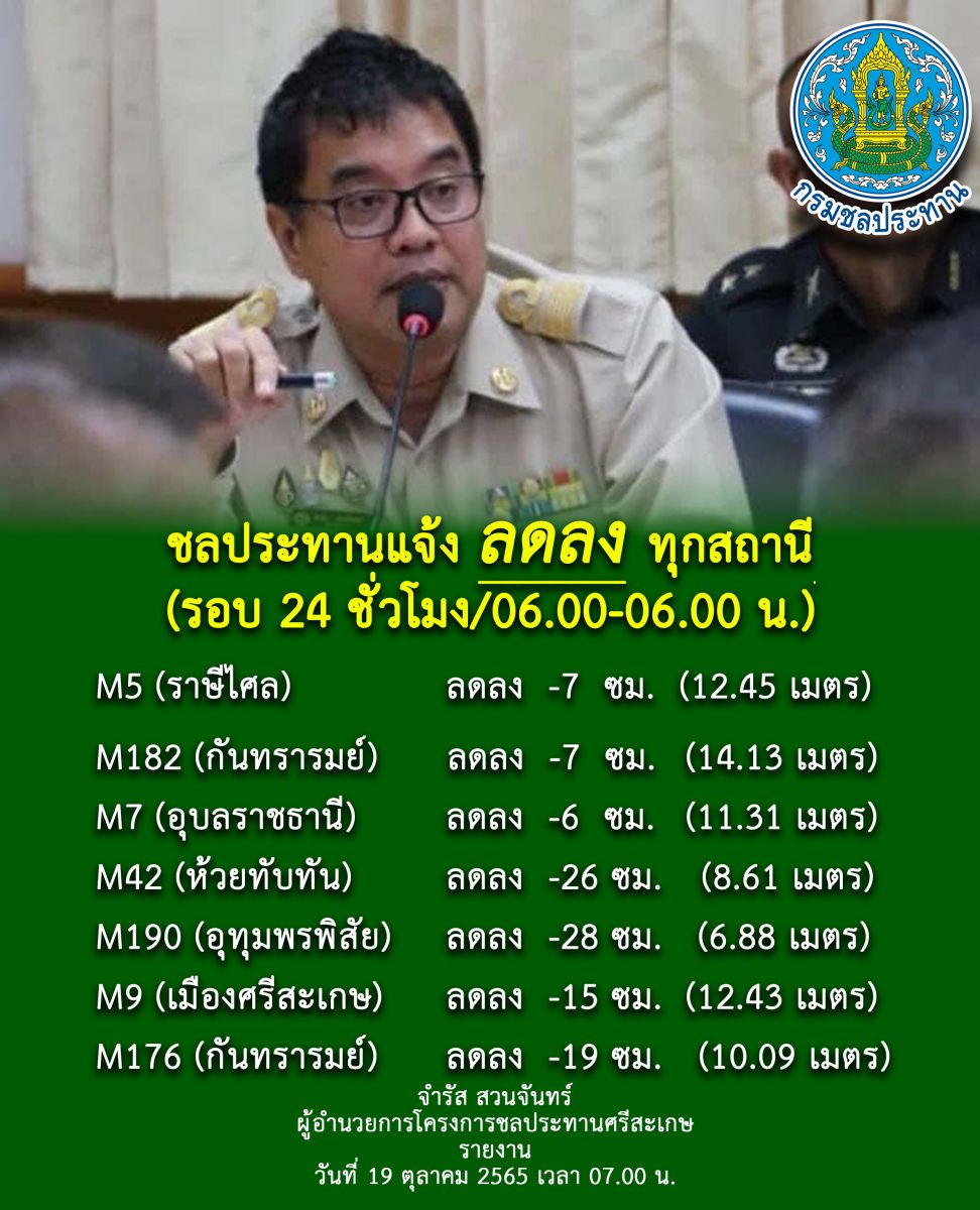 เมื่อวันที่ 19 ตุลาคม 2565 นายจำรัส สวนจันทร์ ผอ.โครงการชลประทานศรีสะเกษ เปิดเผยว่า สถานการณ์น้ำในจังหวัดศรีสะเกษ ในวันนี้มีดังนี้ อ่างเก็บน้ำขนาดกลางทั้ง 16 แห่ง เก็บกักน้ำได้ 208.34 ล้าน ลบ.ม ปัจจุบันเก็บกักได้ 214.01 ล้าน ลบ.ม คิดเป็น 102.91 เปอร์เซ็นต์ แนวโน้มทรงตัวเพื่อรักษาระดับเก็บกัก 100 เปอร์เซ็นต์ และโครงการชลประทานศรีสะเกษ ได้ทำการเสริมกระสอบทรายบริเวณทางระบายน้ำล้น(Spillway) ของอ่างเก็บน้ำประมาณ 30-50 เซนติเมตร โดยมีเกษตรกรกลุ่มผู้ใช้น้ำมีส่วนร่วมในการดำเนินการ เพื่อการเก็บกักน้ำเพิ่มเติม สำหรับไว้ใช้ในฤดูแล้ง และความปลอดภัยของเขื่อนดิน ( Dam Safety) ปกติ ลุ่มน้ำในจังหวัดศรีสะเกษ ทั้ง M9 M42 M176 และ M190 จากการวิเคราะห์จุดตรวจวัด M ต่างๆลดลงทุกแห่ง จากการวิเคราะห์ระดับน้ำในลุ่มน้ำมูลของจังหวัดบุรีรัมย์ สุรินทร์ ศรีสะเกษและจังหวัดอุบลราชธานี พบว่า M6A(บุรีรัมย์) M4(สุรินทร์) M5 (ราษีไศล) M182(กันทรารมย์) และ M7(เมืองอุบลราชธานี) ลดลง กล่าวคือ M6A จากลด 8 ซม. เป็นลดลง 4 ซม. M4 จากลดลง 8 ซม. เป็นลดลง 7 ซม. M5 จากลดลง 5 ซม เป็นลดลง 7 ซม. M182 จากลดลง 5 ซม.เป็นลดลง 7 ซม. และM7 จากลดลง 7 ซม. เป็นลดลง 6 ซม สรุปได้ว่าระดับน้ำในแม่น้ำมูลช่วงจังหวัดบุรีรัมย์ สุรินทร์ ศรีสะเกษและอุบลราชธานี ลดลงทุกสถานี ส่ วนความสูงของน้ำท่วมและการเข้าสู่ภาวะปกติของ M สถานีต่างๆ การคาดการณ์ว่ามีแนวโน้มการเข้าสู่ภาวะปกติของ M สถานีต่างๆในเร็วๆนี้