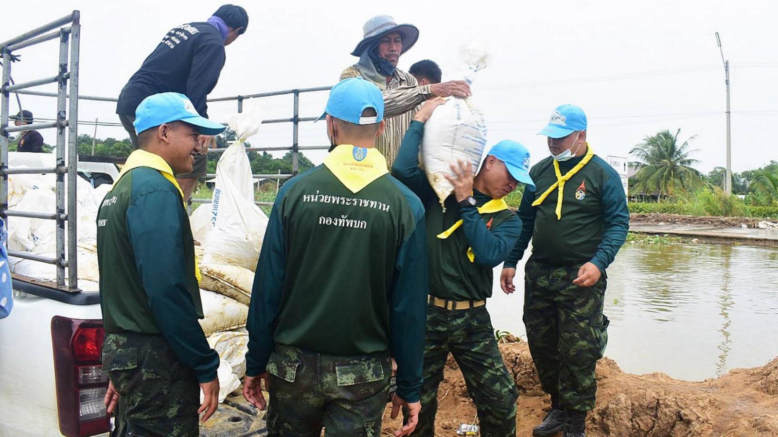 กองทับจัดกำลังพลช่วยเหลือซ่อมแซมคันกั้นน้ำที่ชำรุดรอยต่อลพบุรีสิงห์บุรี