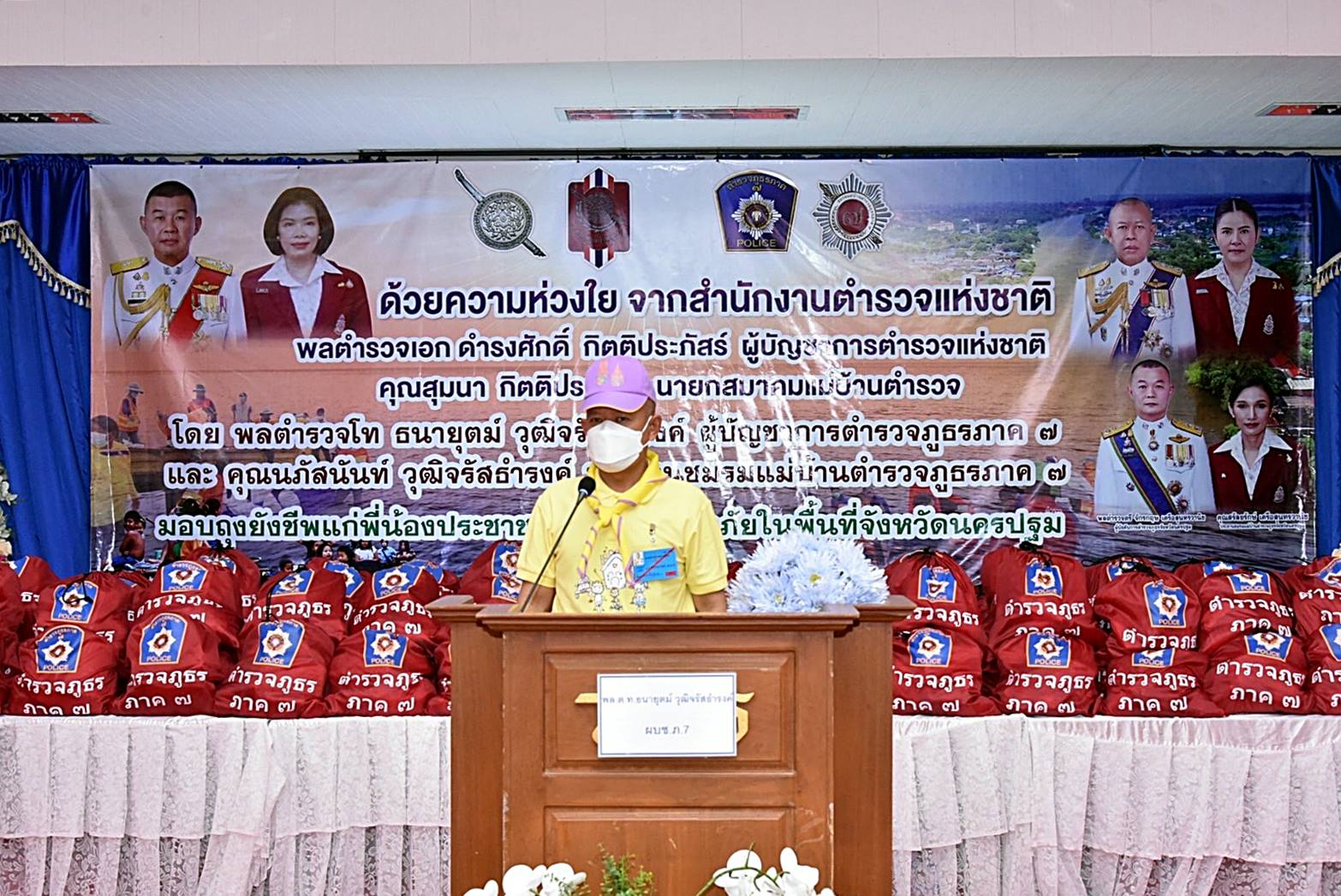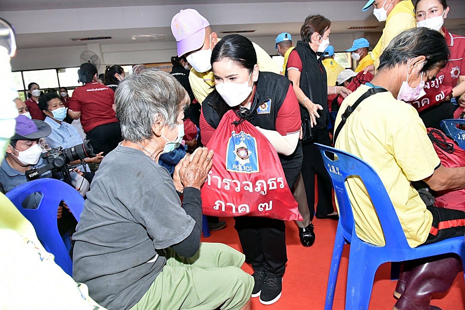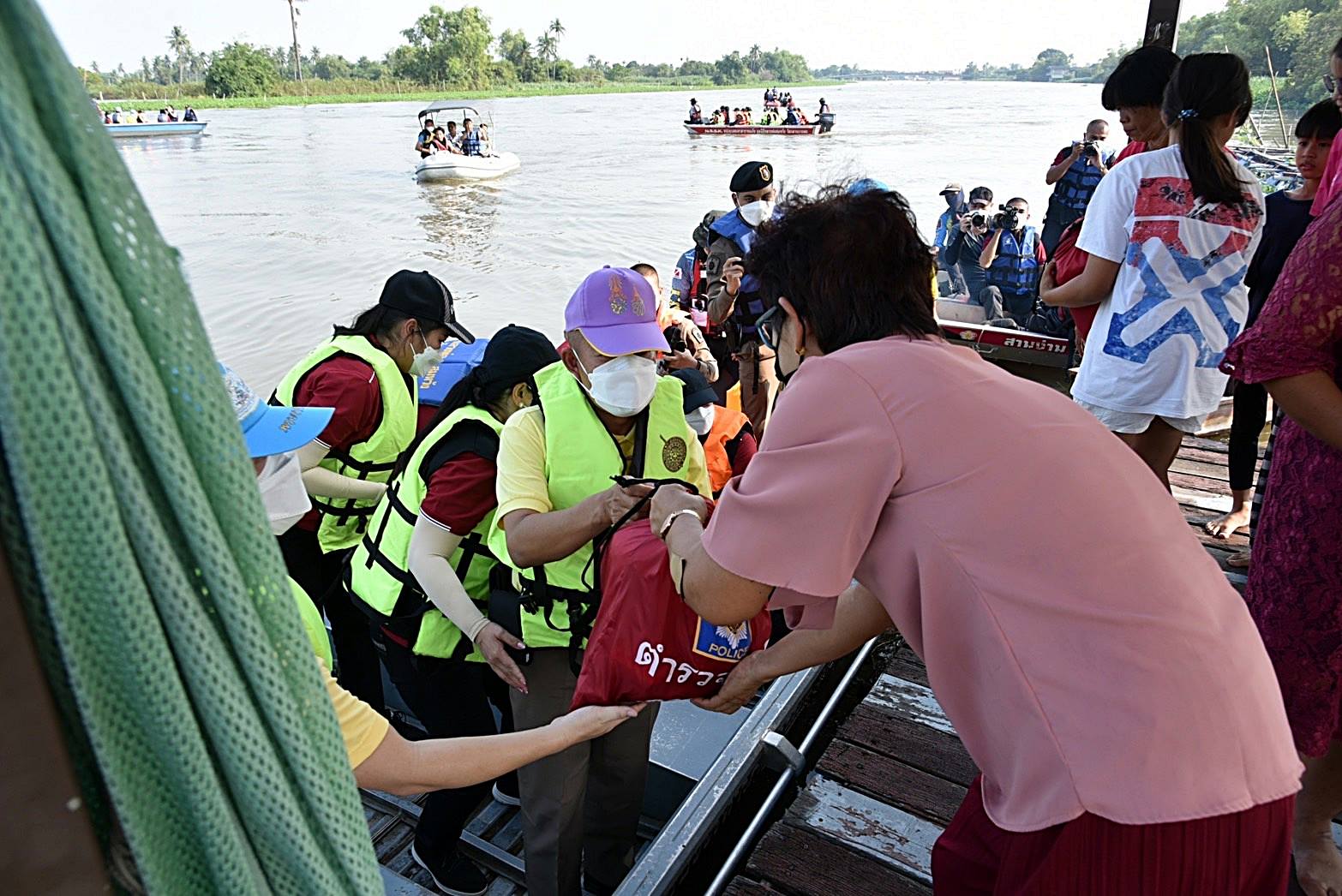 จากนั้น พล.ต.ท.ธนายุตม์ วุฒิจรัสธำรงค์ ผบช.ภ.7 พร้อมด้วย คุณนภัสนันท์ วุฒิจรัสธำรงค์ ประธานชมรมแม่บ้านตำรวจภูธรภาค 7 และคณะแม่บ้านตำรวจได้ลงเรือที่บริเวณท่าน้ำวัดสำโรง นำถุงยังชีพไปแจกจ่ายให้กับ พ่อ แม่ พี่น้องประชาชนที่ประสบอุทกภัยน้ำท่วมไปสามารถออกมาได้