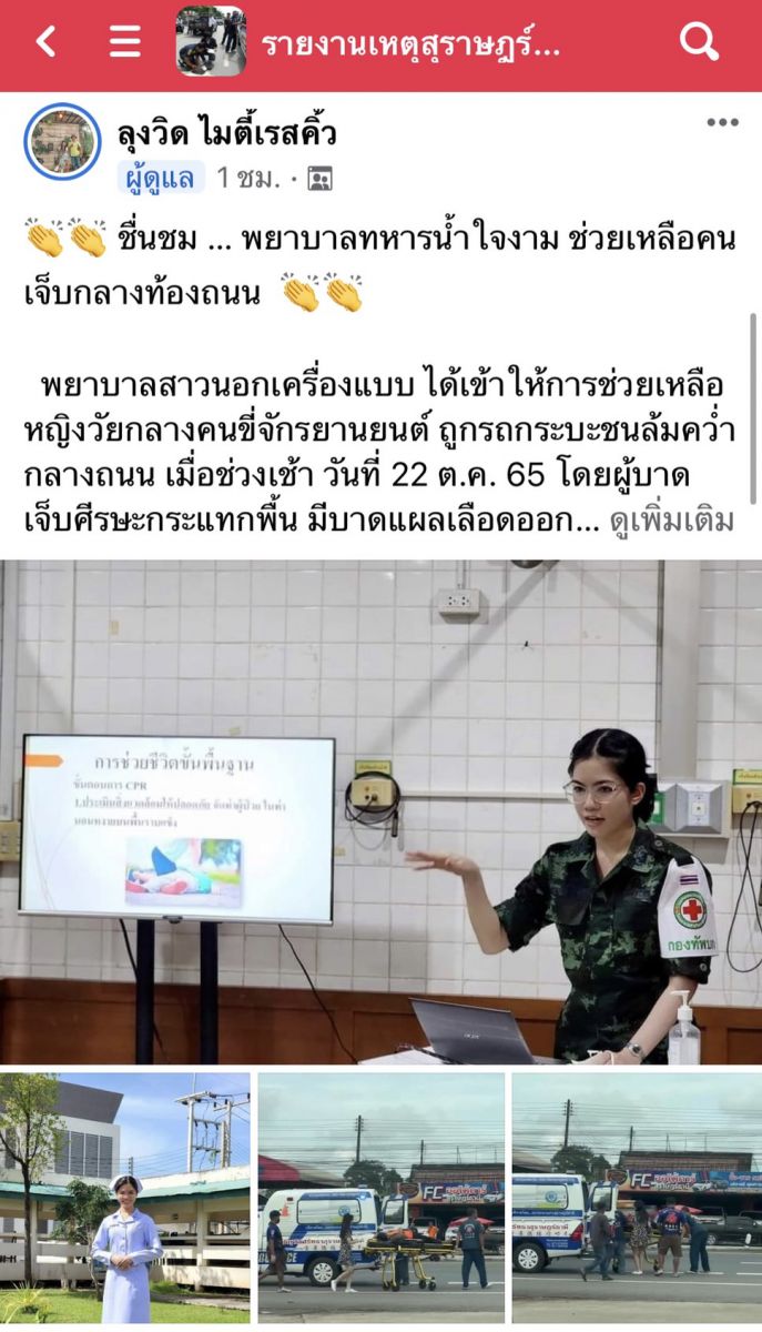 เมื่อวันที่ 23 ตุลาคม ที่ จ.สุราษฎร์ธานี ผู้สื่อข่าวรายงานว่า เพจเฟซบุ้ค “รายงานเหตุสุราษฎร์ธานี มูลนิธิกุศลศรัทธาสุราษฎร์ธานี Vitrescue “ โดยลุงวิด ไมตี้เรสคิว ของทีมอาสาสมัครกู้ชีพกู้ภัย ได้โพสต์ภาพการช่วยเหลือผู้ประสบอุบัติเหตุและข้อความระบุว่า พยาบาลสาวนอกเครื่องแบบ ได้เข้าให้การช่วยเหลือหญิงวัยกลางคนขี่จักรยานยนต์ ถูกรถกระบะชนล้มคว่ำกลางถนน เมื่อช่วงเช้า วันที่ 22 ต.ค.65 โดยผู้บาดเจ็บศีรษะกระแทกพื้น มีบาดแผลเลือดออก แน่นหน้าอกหายใจลำบาก พยาบาลทหารน้ำใจงาม ขับรถผ่านมาเห็นเหตุการณ์ ไม่ดูดายเข้าไปช่วยเหลือทันที