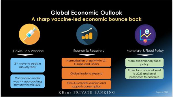 Lombard Odier และ KBank Private Banking มองภาพรวมเศรษฐกิจโลกยังเป็นบวก มีการฟื้นตัวได้ดี แม้การแพร่ระบาดของโรคโควิด-19 จะยังไม่สิ้นสุด แต่คาดว่าตัวเลขผู้ติดเชื้อจะแตะระดับสูงสุดในเดือนมกราคม-กุมภาพันธ์ 2564 นี้ โดยเศรษฐกิจโลกจะได้รับแรงหนุนจากการเร่งอนุมัติและแจกจ่ายวัคซีน ซึ่งคาดว่าจะมีประสิทธิภาพควบคุมการแพร่ระบาดได้ โดยประชากรทั่วโลกกำลังทยอยได้รับวัคซีน ซึ่งคาดว่าจะเกิดภูมิคุ้มกันหมู่ในช่วงกลางปี 2564 และจะส่งผลให้ธุรกิจต่างๆ ทั้งด้านการค้าขาย การผลิต และการบริโภค สามารถกลับมาเปิดได้อย่างเต็มรูปแบบ เช่นเดียวกับช่วงก่อนเกิดการระบาดในที่สุด