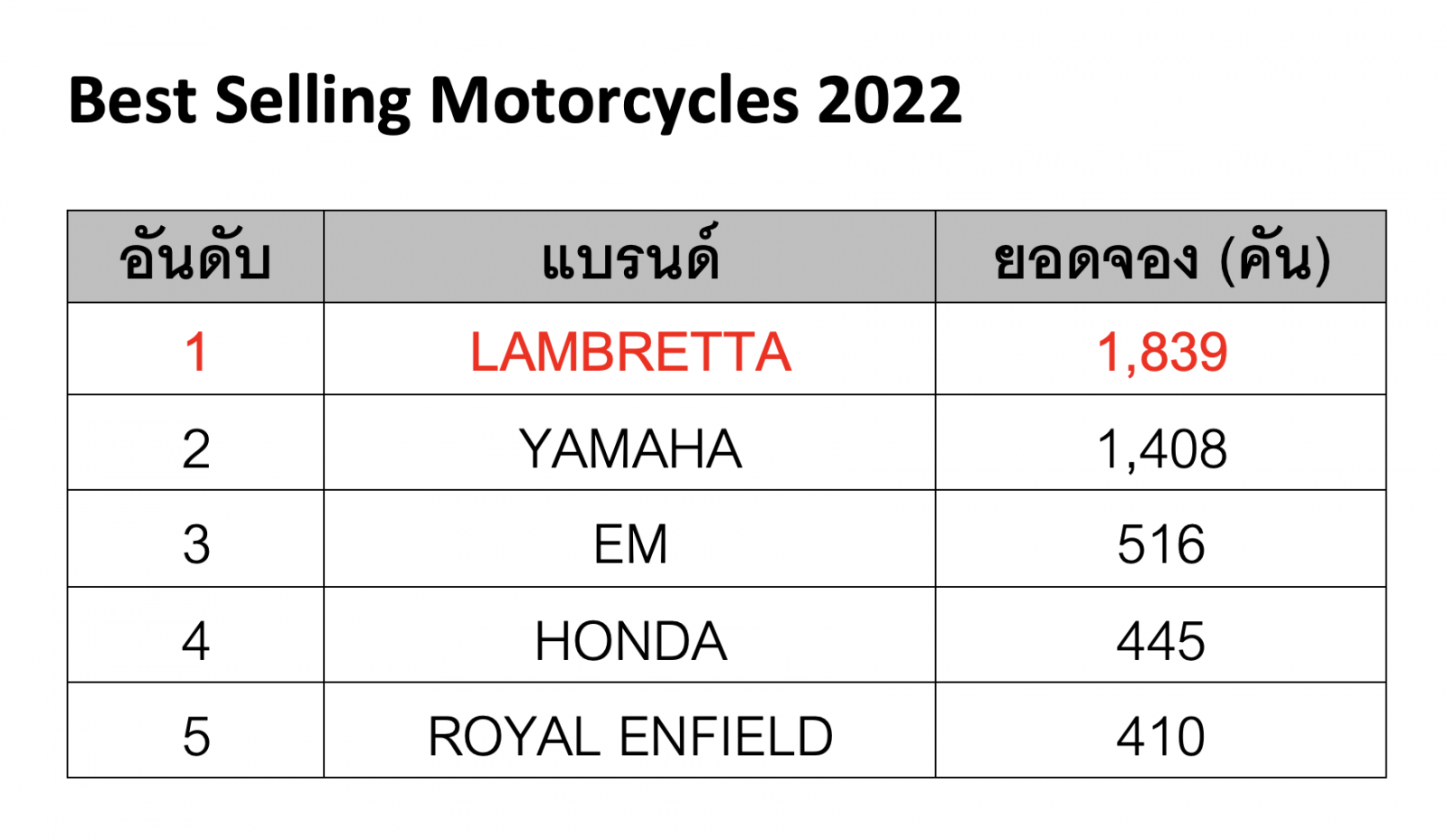 ทั้งนี้ในงานมหกรรมยานยนต์ ครั้งที่ 39 (Motor Expo 2022)มียอดจองจักรยานยนต์รวมทั้งสิ้น 6,089 คันโดยLAMBRETTAคว้าอันดับ 1 ที่มียอดจองสูงที่สุดในงาน มียอดจองทั้งสิ้น 1,839 คันหรือคิดเป็นกว่า 30% ของยอดจองทั้งงาน