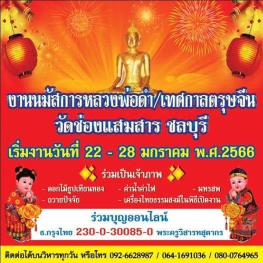 และในปีนี้ ทางวัดช่องแสมสาร โดยพระครูวิสารทสุตากร เจ้าคณะตำบลพลูตาหลวง/เจ้าอาวาสวัดช่องแสมสาร ได้ดำริให้จัดงานเทศกาลตรุษจีนปิดทองหลวงพ่อดำขึ้นอีกครั้งหลังจากปีที่ผ่านๆ มาได้งดจัดงานไปเนื่องจากสถานการณ์โควิด โดยกำหนดเริ่มงานวันที่ 22 - 28 มากราคม 2566 นี้ สาธุชนที่ประสงค์จะเดินทางมาสักการะปิดทองหลวงพ่อดำในงานนี้ก็อย่าลืมอย่าพลาดกัน และท่านที่ต้องการร่วมบุญในครั้งนี้ สามารถร่วมเป็นเจ้าภาพ ดอกไม้ธูปเทียนทอง ค่าน้ำค่าไฟ ค่ามหรสพ ค่าถวายปัจจัย ค่าเครื่องไทยธรรมสงฆ์ในพิธีเปิดงาน สามารถร่วมบุญได้ทุกวันที่วัดช่องแสมสารหรือที่วิหารหลวงพ่อดำ หรือไม่สะดวกมาก็สามารถทำบุญออนไลน์ได้เช่นกัน โดยโอนเงินผ่านธนาคารกรุงไทย เลขที่บัญชี 230-0-30085-0 ชื่อบัญชีพระครูวิสารทสุตากร