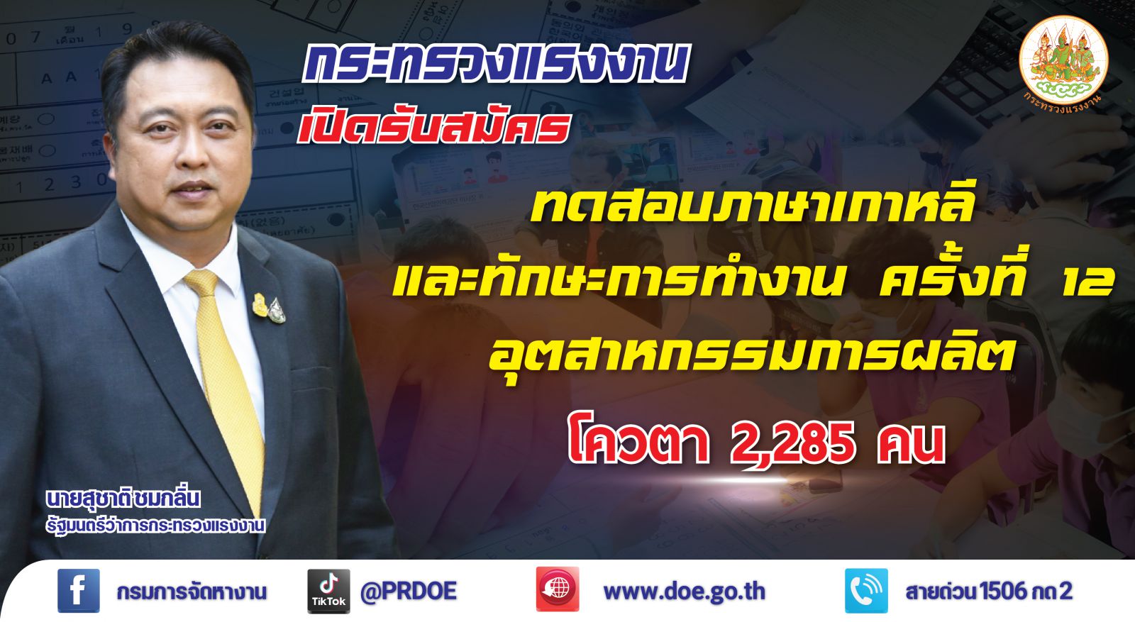 Permit System for Foreign Workers: EPS) ซึ่งกำหนดให้กรมการจัดหางานเป็นหน่วยงานผู้ทำหน้าที่รับสมัคร และทักษะการทำงาน ตามที่สำนักบริการพัฒนาบุคลากรแห่งเกาหลี (Human Resources Development Service of Korea: HRD Korea) ซึ่งเป็นผู้รับผิดชอบการจัดสอบกำหนด โดยครั้งนี้ได้ประกาศรับสมัครทดสอบภาษาเกาหลีและทักษะการทำงาน (Point System) ครั้งที่ 12 ผ่านระบบอิเล็กทรอนิกส์การบริหารแรงงานไทย ไปต่างประเทศ (e-Service) และชำระเงินค่าสมัครสอบแบบอิเล็กทรอนิกส์ (e-Payment) เพื่อสมัครไปทำงานสาธารณรัฐเกาหลีตามระบบการจ้างแรงงานต่างชาติ (EPS) ประเภทกิจการอุตสาหกรรมการผลิต (เพศชาย) โดยให้โควตาผู้สอบผ่าน 2,285 คน กำหนดรับสมัครตั้งแต่บัดนี้ถึง 5 กุมภาพันธ์ 2566