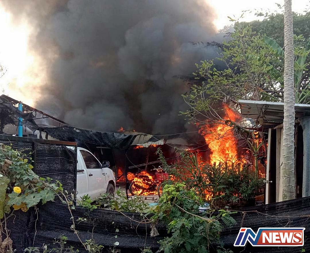 ไฟไหม้บ้านพักแรงงานพม่าสูญทอง4บาทไก่ชนหลายตัวถูกย่างสด