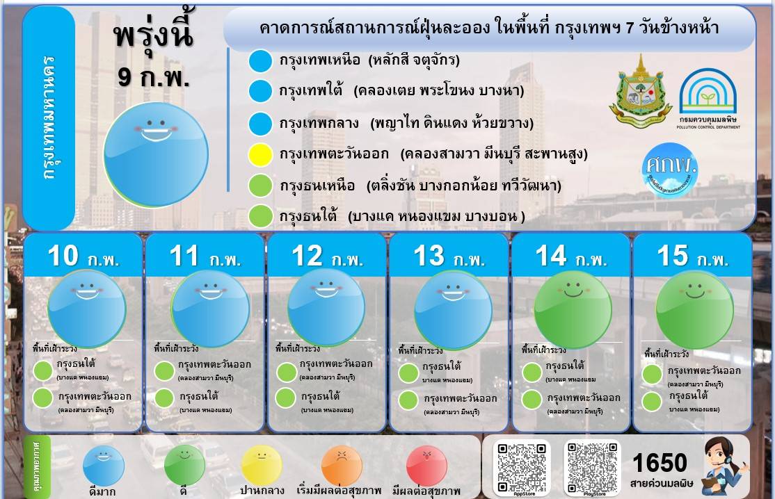 และช่วงวันที่ 8-14 ก.พ. 2566 พื้นที่กรุงเทพและปริมณฑลมีแนวโน้มคุณภาพอากาศอยู่ในเกณฑ์คุณภาพอากาศที่ดีเนื่องจากสภาพอากาศที่เปิดมากขึ้น และมีลมใต้ที่มีกำลังค่อนข้างแรงช่วยพัดพาฝุ่นละออง ออกจากพื้นที่