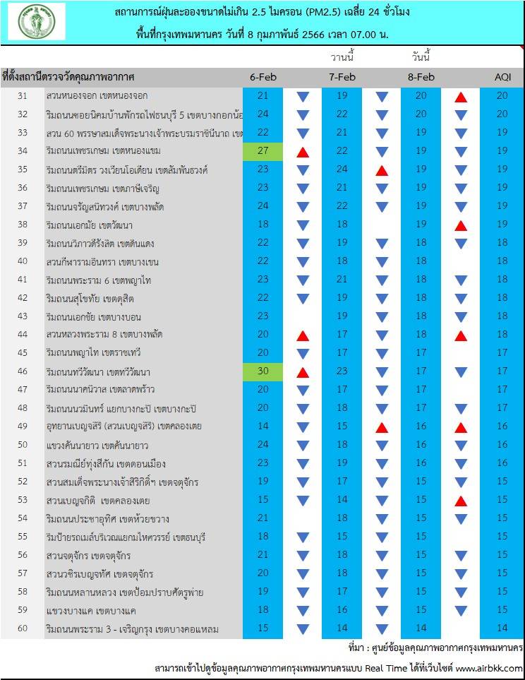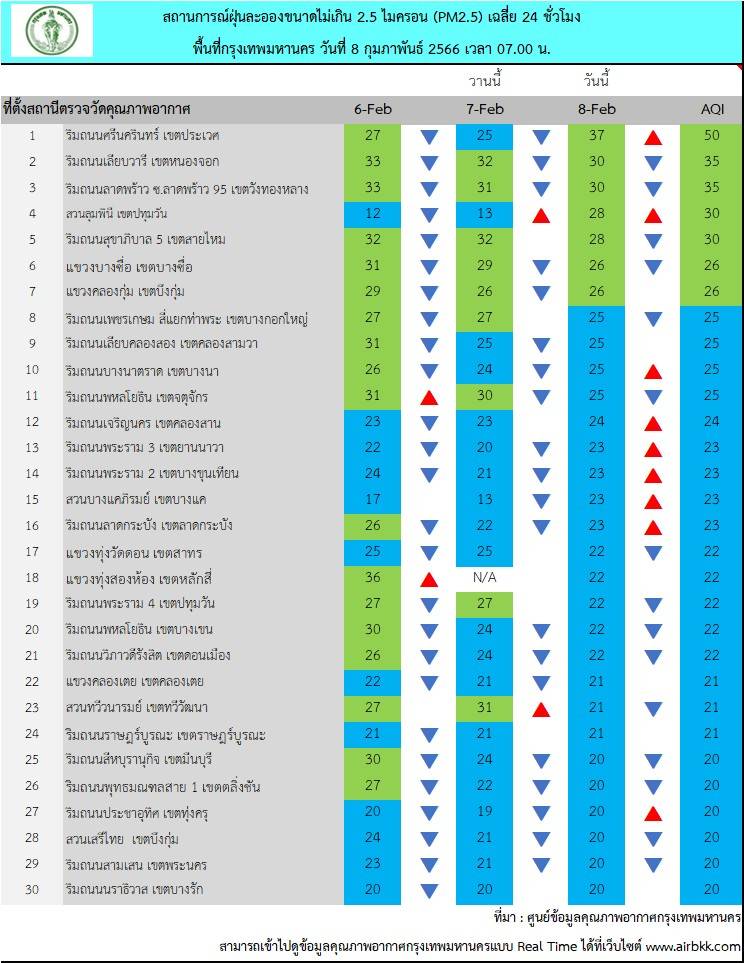 กรุงเทพฯ-ศูนย์ข้อมูลคุณภาพอากาศกรุงเทพมหานครขอสรุปผลการตรวจวัด PM2.5 วันที่ 8 กุมภาพันธ์ 2566 เวลา 05.00-07.00 น. (3 ชั่วโมงล่าสุด)ตรวจวัดได้ 11-37 มคก./ลบ.ม.ค่าเฉลี่ยของกรุงเทพมหานคร 19.3 มคก./ลบ.ม.ค่า PM2.5 มีแนวโน้มเพิ่มขึ้นและอยู่ในเกณฑ์มาตรฐานทุกสถานีที่มีการตรวจวัด