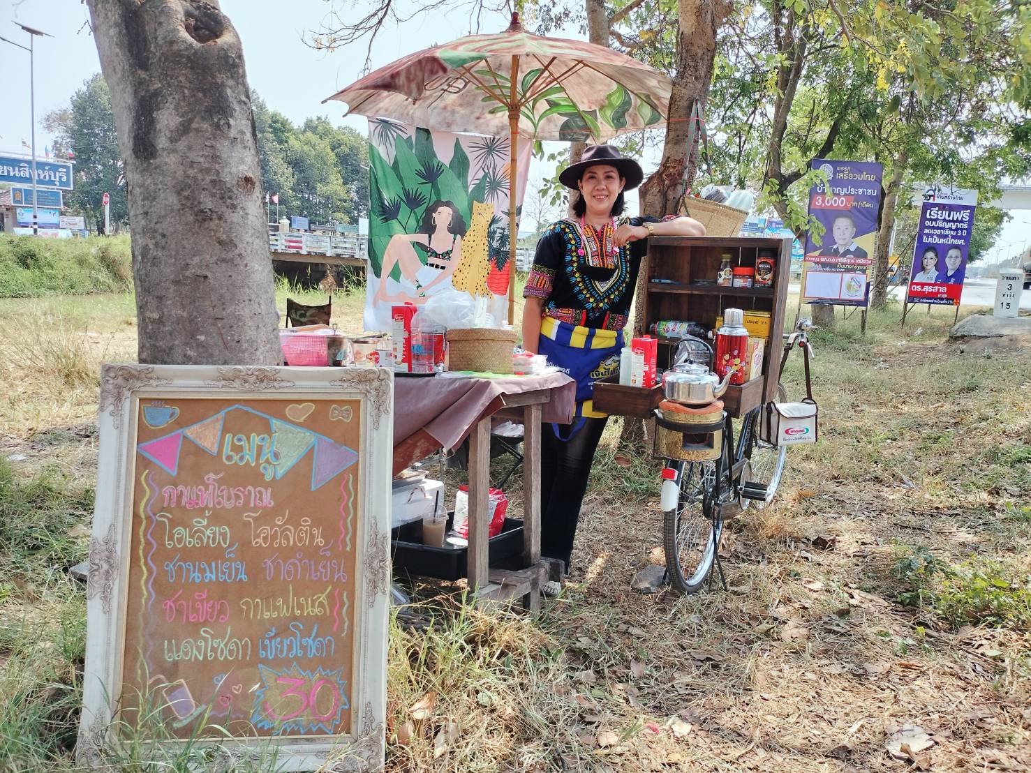 สำหรับป้ายที่ทำเป็นเมนูเครื่องดื่มก็จะเป็นกรอบไม้แนววินเทจเก่าๆ โดยเขียนเมนูเครื่องดื่มมี 9 เมนู คือ กาแฟโบราณ โอวัลติน ชานมเย็น ชาเขียว โอเลี้ยง แดงโซดา เขียวโซดา ชาดำเย็น กาแฟธรรมดา ซึ่งทุกเมนูราคาเพียงแก้วละ 30 บาทเท่านั้น สร้างรายได้วันละ 1500 – 2,000 บาท ไม่ต้องเสียค่าที่และค่าน้ำมันวิ่งไป-กลับบ้าน ใช้เวลาว่างให้เกิดประโยชน์ ใช้ฝีมือที่มีอยู่ปรับตัวสู้กับสภาวะเศรษฐกิจในปัจจุบัน ขายของราคาไม่แพงแต่ได้จำนวนเยอะพอมีกำไรสามารถอยู่ได้อย่างมีความสุขและพอเพียงด้วย สามารถมาอุดหนุนได้โดยเปิดทุกวันตั้งแต่เวลา 8.30 น. ถึง 17.00 น. ราคาไม่แพงแถมอร่อยมากด้วยค่ะ